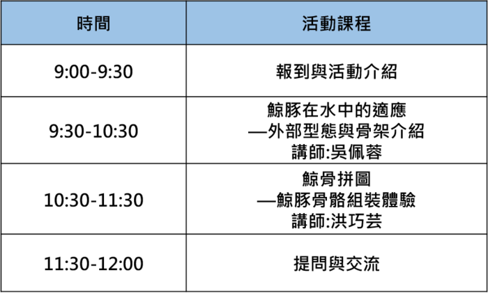 本次活動將透過簡報及鯨豚骨骼實體拼圖的方式,讓學員在講師指導下完成鯨豚骨骼拼接,了解鯨豚的身體構造。