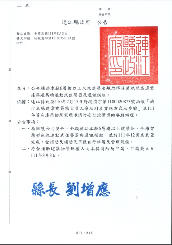 公告補助6層樓以上建物連動式住警器