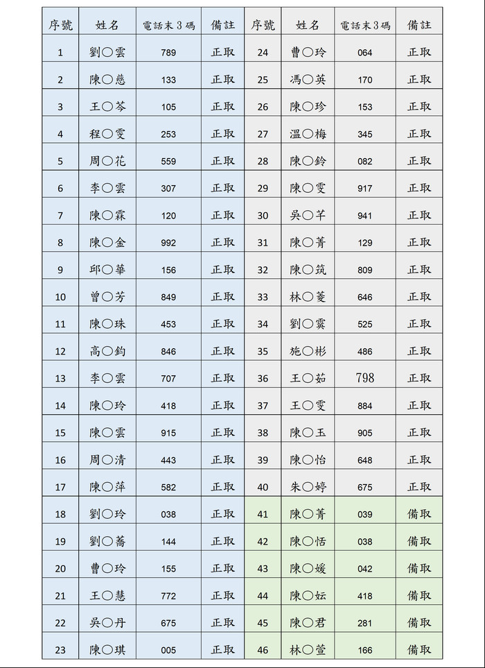 備取及未列入名單中候補人員,如有補上會電話通知。