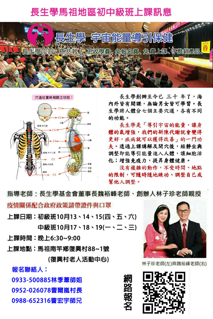 「長生學」馬祖地區初、中級研習班 --閱讀人次 : 852 「長生學」馬祖地區 初、中級研習班(報名至10月12日止)
