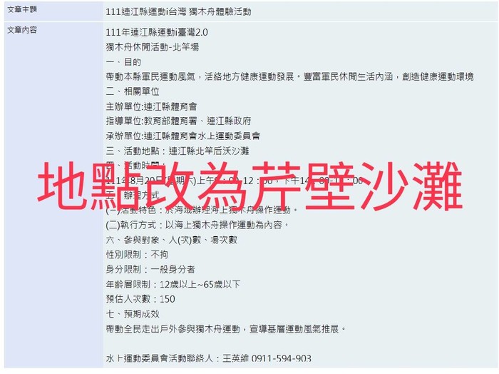 連江縣水上運動委員 活動聯絡人:王英維0911594903
