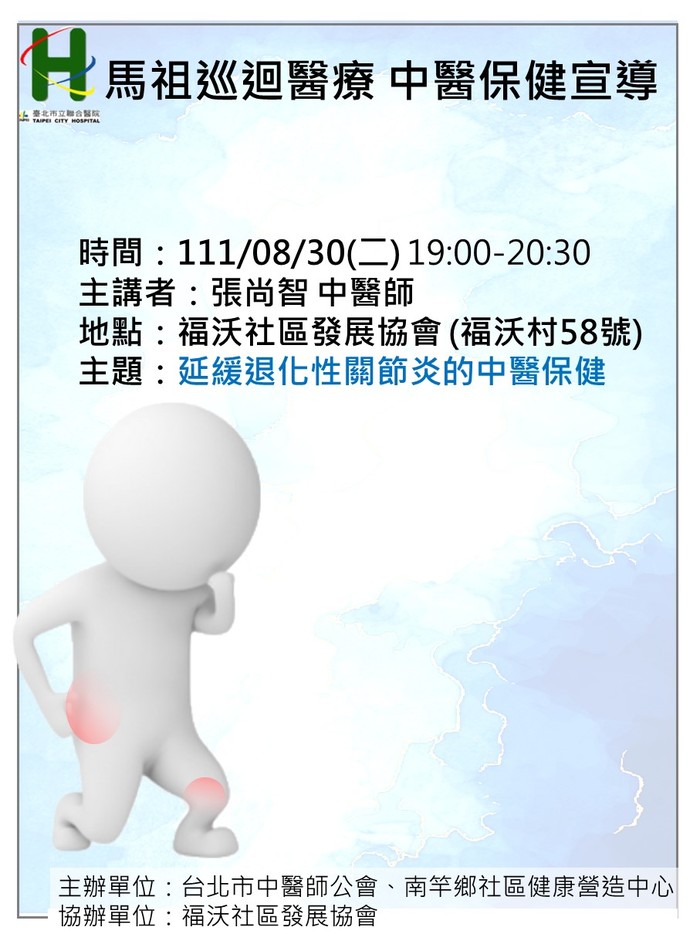 預計在8/30(二) 19:00-20:30於 南竿 福沃社區發展協會 (舊街內-福沃村58號),有由張尚智中醫師為各位宣導「中醫講座-延緩退化性關節炎的中醫保健」,歡迎有興趣的民眾踴躍參加,報名網址為