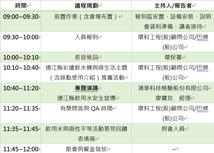 本活動將透過有獎徵答加深民眾對飲用水安全的印象,進而了解連江縣內的飲水機設置與減少塑膠對環境的影響藉以將日常生活採取綠色行動,現場也會提供宣導品與餐盒,歡迎有興趣的民眾填寫報名表單