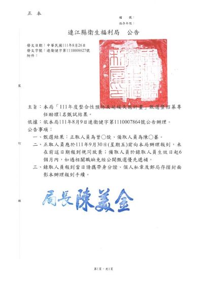 本局甄整合性預防及延緩失能計畫專任助理1名結果公告
