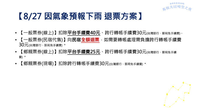 因節目可能遇雨而做調整、異動,為維護各位旅客的權益,今日場次將予以退費,
