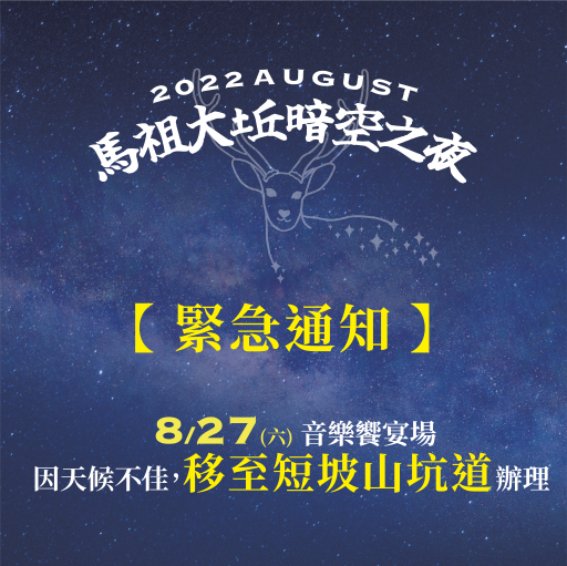 8/27(六)場次之2022 馬祖北竿大坵暗空之夜・初心 音樂饗宴場,將調整至 短坡山 辦理。