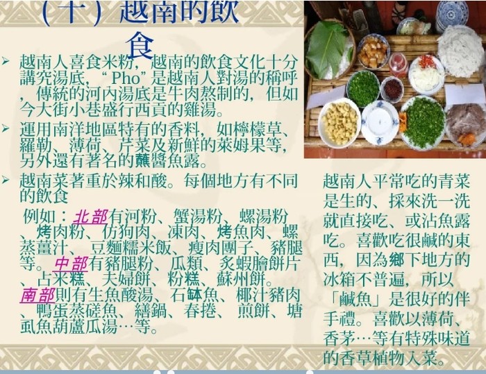 越南飲食,又稱「越南料理」、「越南菜」,泛指越南族的飲食文化。 越南菜多使用魚露、醬油、大米、新鮮香草、清新水果和生鮮蔬菜。越南位處南方,食譜使用許多熱帶蔬菜、草藥和香料,包括檸檬草、青檸和馬蜂柑葉,調味料豐富。由於佛教信仰,越南也有一些素食菜餚。越南料理中最常見的肉類是豬肉、牛肉、雞肉、蝦、扇貝和各種海鮮。 維基百科