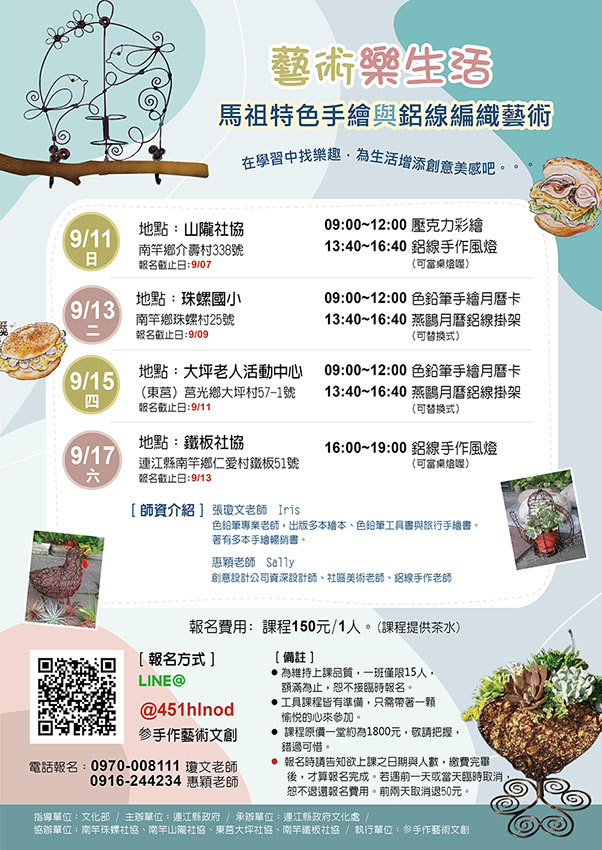 馬祖特色手繪與鋁線編織藝術歡迎報名! --閱讀人次 : 911 藝術樂生活 × 馬祖特色手繪與鋁線編織藝術