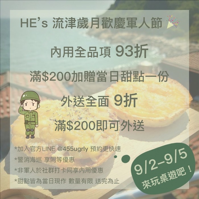 致敬辛苦的國軍,9/2~9/5 HE’s流津歲月要來歡慶軍人節啦!!!
