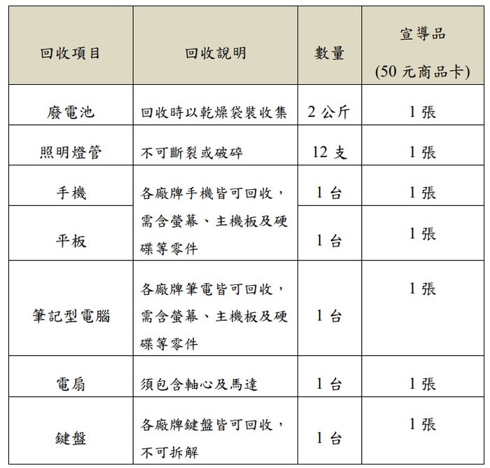 備註:行動資收站完成上述資收物回收工作其中1項給予等值宣導品