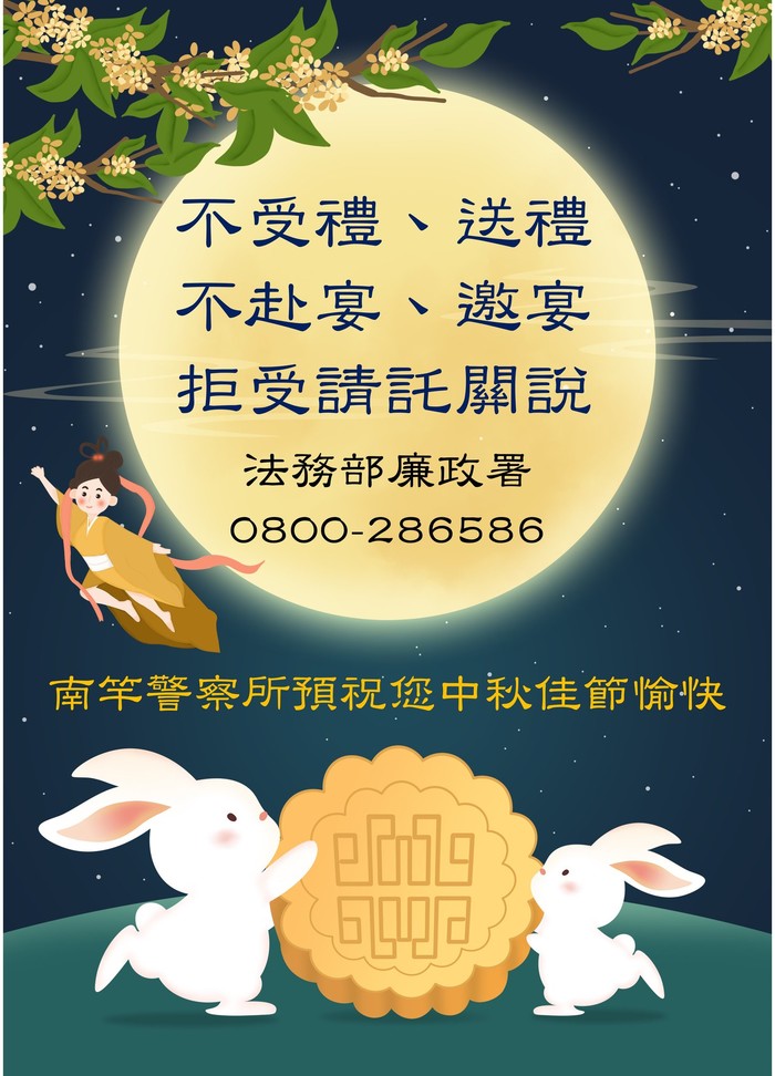 111年中秋佳節將近,為端正警察風紀,樹立廉能政風,貫徹公務員廉政倫理規範要求,革除不當受贈財物、飲宴應酬、請託關說等陋習,籲請鄉親響應政府政令,支持本警察所落實「不送禮、不受禮、不赴(邀)宴、拒受請託關說」之規定,共同建構優質公務環境、攜手打造廉能政府。