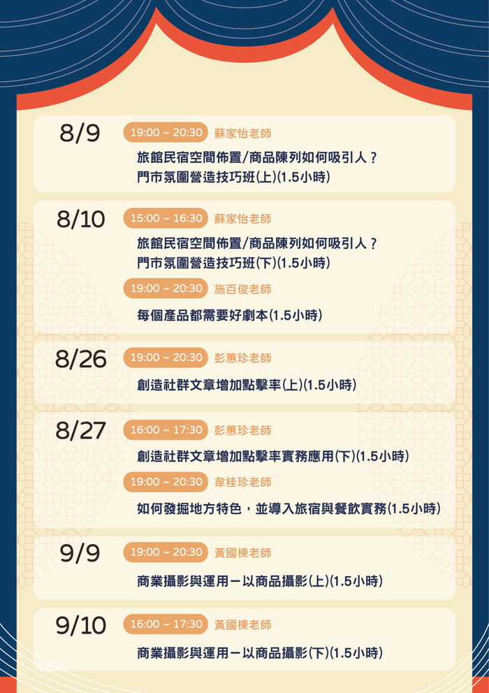 本次就不同專業講師自身豐富之經營經驗來帶領業者了解市場走向,並透過「企劃、服務、旅宿、餐飲、行銷」五個層面,以講師的經驗分享行銷課程、店面美化、商品攝影,及如何行銷優化本店。