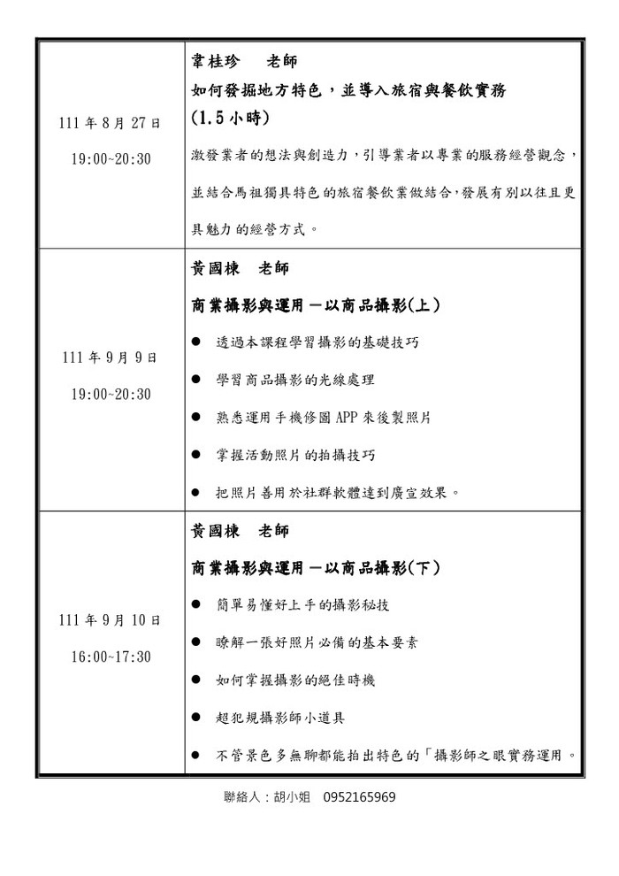 聯絡資訊:胡小姐 ( 連絡電話:0952165969 )