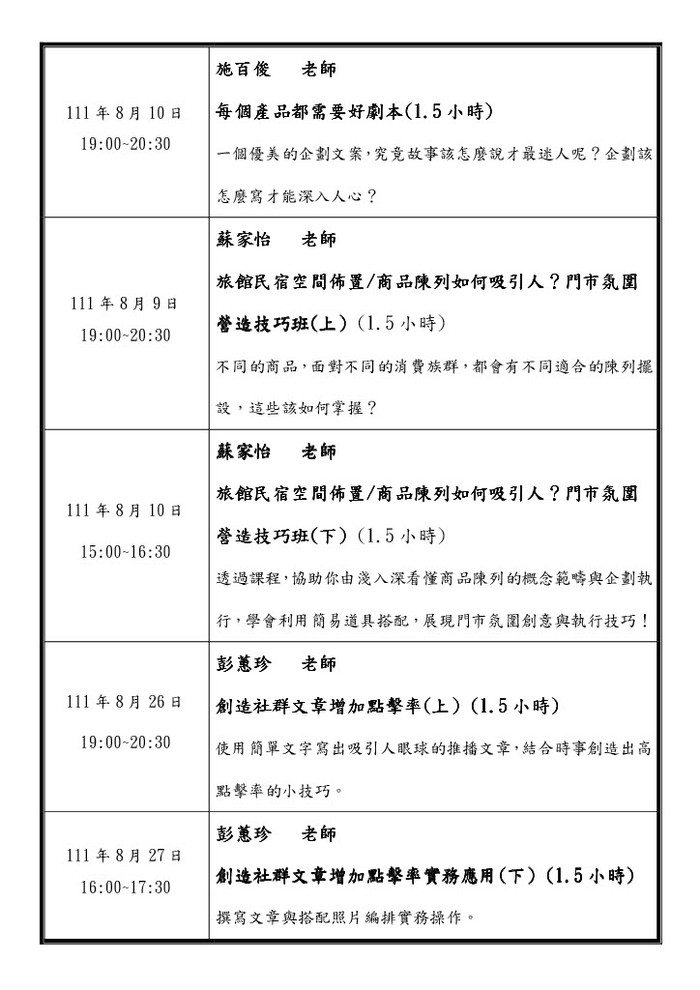 課程共規劃12小時課程,提供商圈店家進修並設計有結業證書。