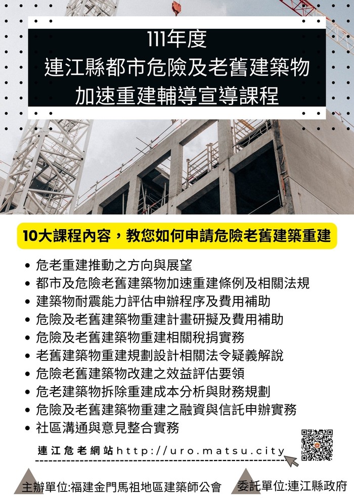危老建築加速重建宣導課程時間公告 --閱讀人次 : 730 福建金門馬祖地區建築師公會針對本縣「都市危險及老舊建築物加速重建」業務