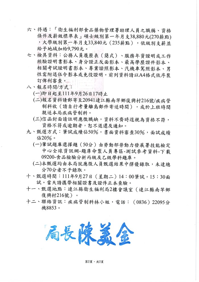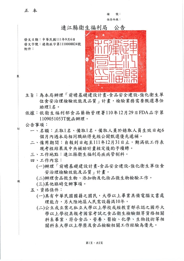 衛福局徵選前瞻計畫檢驗業務專任助理1名