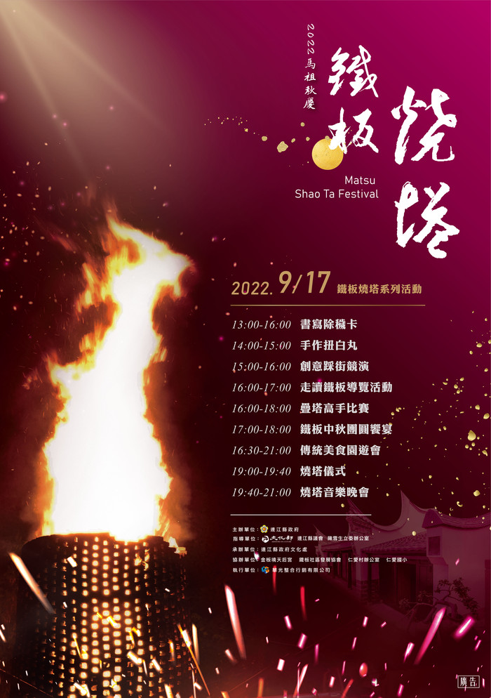 燒塔節將於9月17日週六展開,活動從下午1點到晚間9點,包含扭白丸體驗、創意踩街競演、疊塔高手比賽、走讀鐵板聚落導覽解說、特色美食園遊會、鐵板中秋團圓饗宴、燒塔儀式及燒塔音樂晚會,鐵板社區歡迎鄉親一起來除穢迎接正能量,祈願平安順心疫情散退。