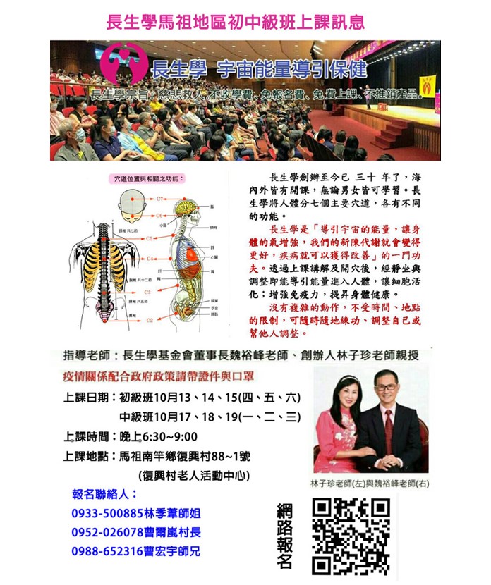 長生學」馬祖地區初、中級研習班 --閱讀人次 : 677 「長生學」馬祖地區 初、中級研習班(報名至10月12日止)