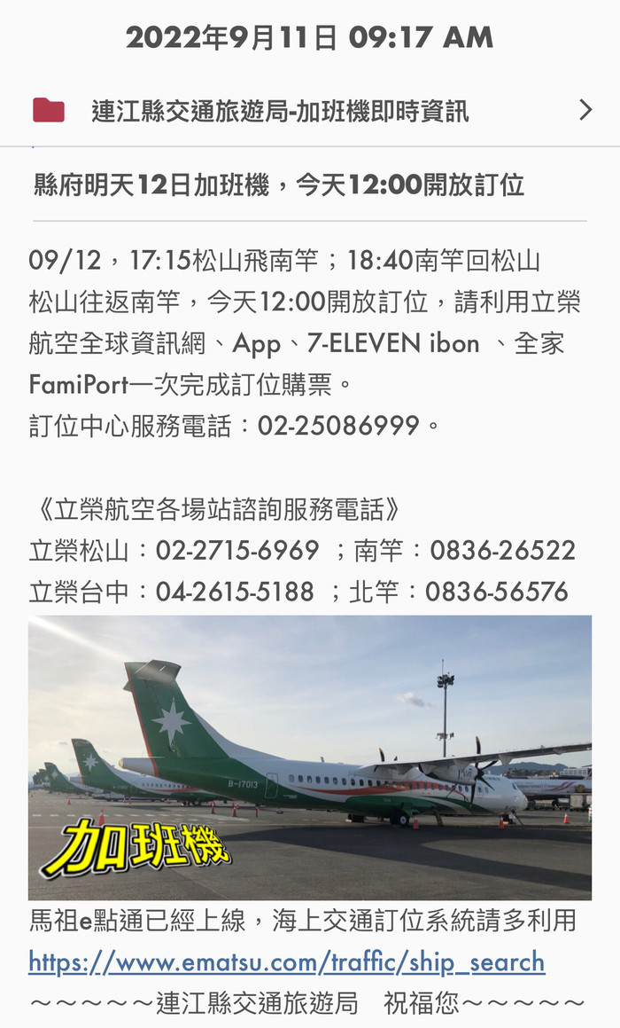縣府12日加1班機,今(11)日中午12:00開放雙向訂位,連江縣交旅局請鄉親利用立榮航空全球資訊網、App、7-ELEVEN ibon 、全家FamiPort一次完成訂位購票。