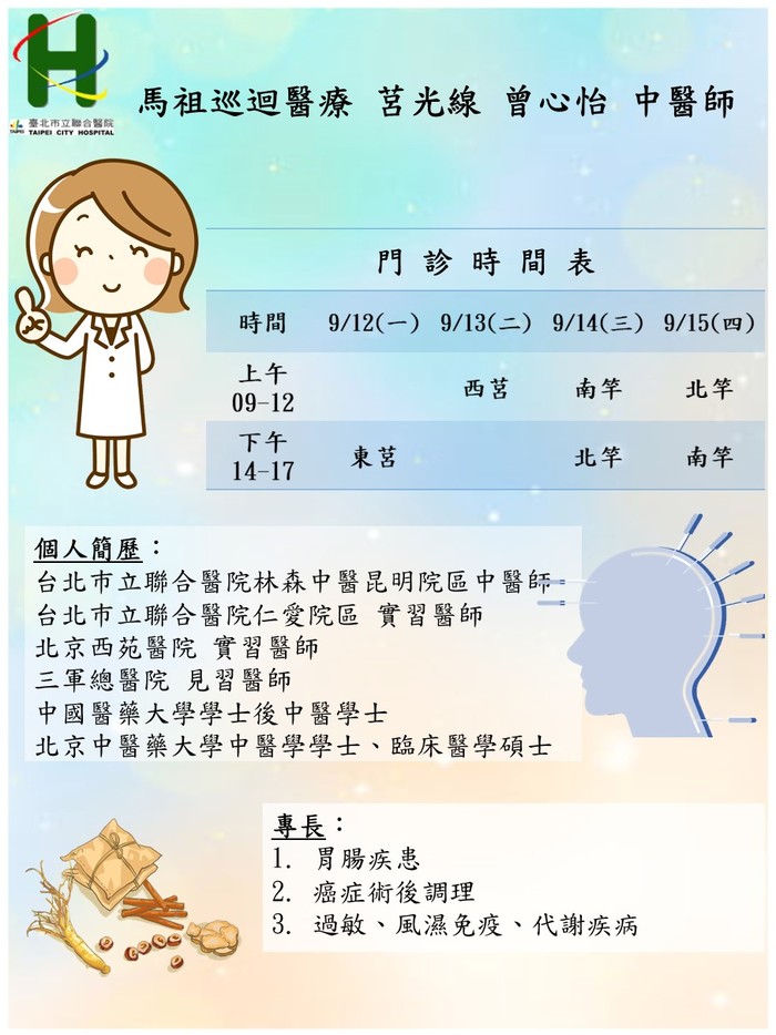 馬祖中醫巡迴醫療111/09/12-09/15由莒光線 曾心怡醫師、東引線 林文郁醫師前往支援服務,若有中醫相關健康需求,請大家多多利用。
