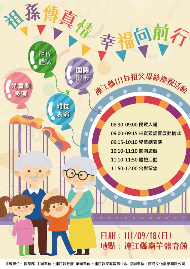 祖父母節慶祝活動周末登場 邀您一起同樂 --閱讀人次 : 1014 連江縣111年祖父母節慶祝活動
