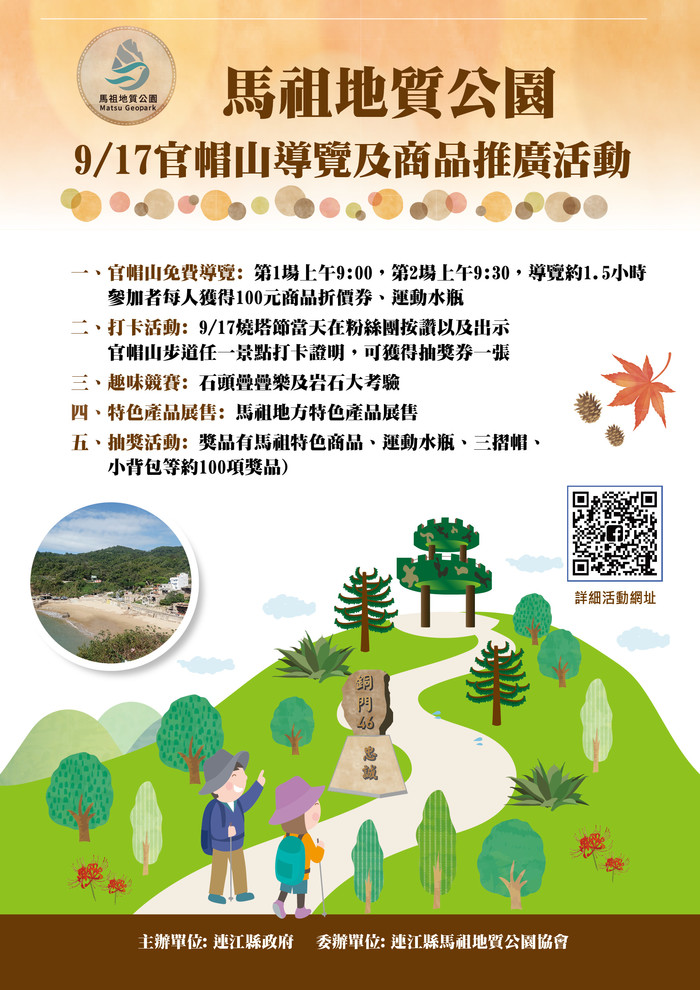 9/17馬祖地質公園官帽山導覽及商品推廣 --閱讀人次 : 903 馬祖地質公園將在9月17日同時在9月17日上午安排兩場免費官帽山導覽活動,讓您認識鐵板村的由來以及官帽山的軍事秘境,參加者贈送限量運動水瓶一個,以及100元商品折價券,還有機會參加抽獎
