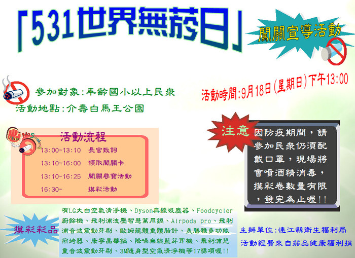 9/18「531世界無菸日」闖關活動 --閱讀人次 : 1256 每年的5月31日,世界衛生組織及全球合作伙伴自1988年起訂為世界無菸日(World No Tobacco Day,WNTD),且均會訂定一個中心主題,強調菸品使用所造成的健康風險,倡議採取確實有效的政策,以減少菸品消費。
