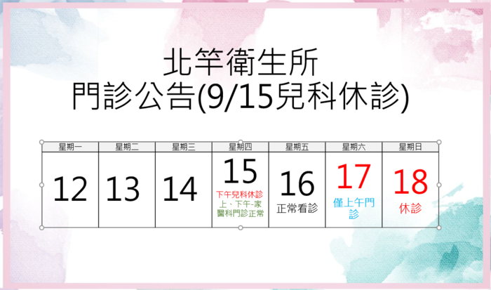 北竿衛生所因故9/15下午兒科休診一次,造不便請鄉親見諒