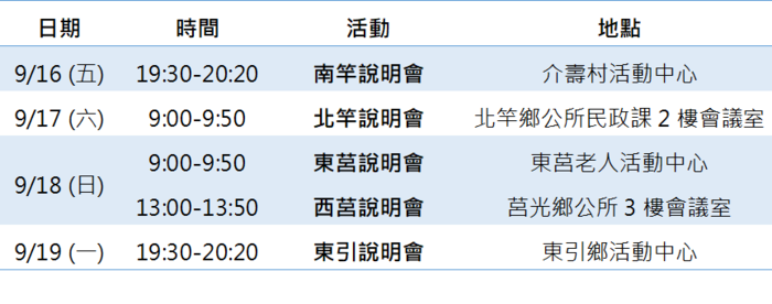 日期:9/16(五)19:30南竿鄉、9/17(六)9:00北竿鄉、9/18(日)9:00東莒&13:00西莒、9/19(一)19:30東引鄉