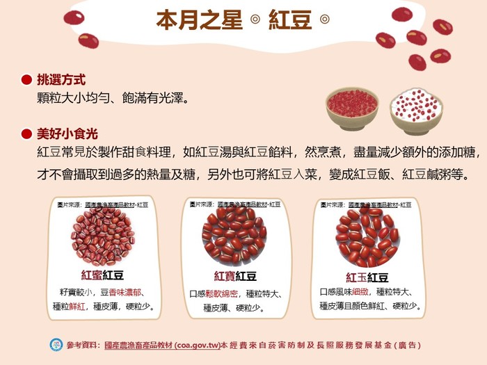 紅豆是台灣人重要的食物來源,我們日常所食用的紅豆屬小豆類,是秋季裡作的雜糧作物,而因為栽種的品種種皮多為紅色,因此稱之為「紅豆」。