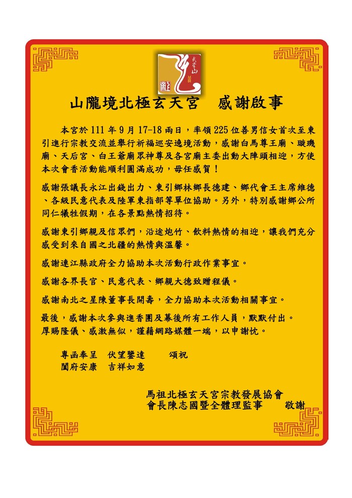 山隴境北極玄天宮感謝啟事