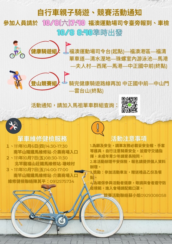 已報名參加騎遊及競賽人員,請於111年10月8日上午7:40至福澳運動場司令臺旁報到、車檢,8:40準時出發!!