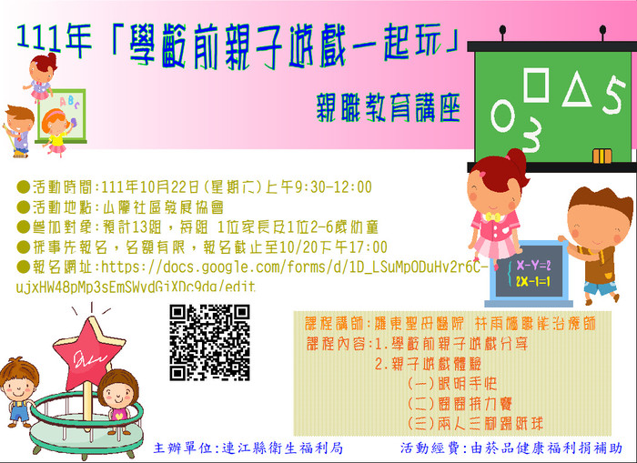 已額滿10/22學齡前親子遊戲一起玩 --閱讀人次 : 709 為提供父母有關子女發展及教養子女的知識,協助父母更有效的暸解子女身心發展的狀況與需求,並提升子女發展能力、適應的相關知識與技能,進而促進家庭生活幸福。