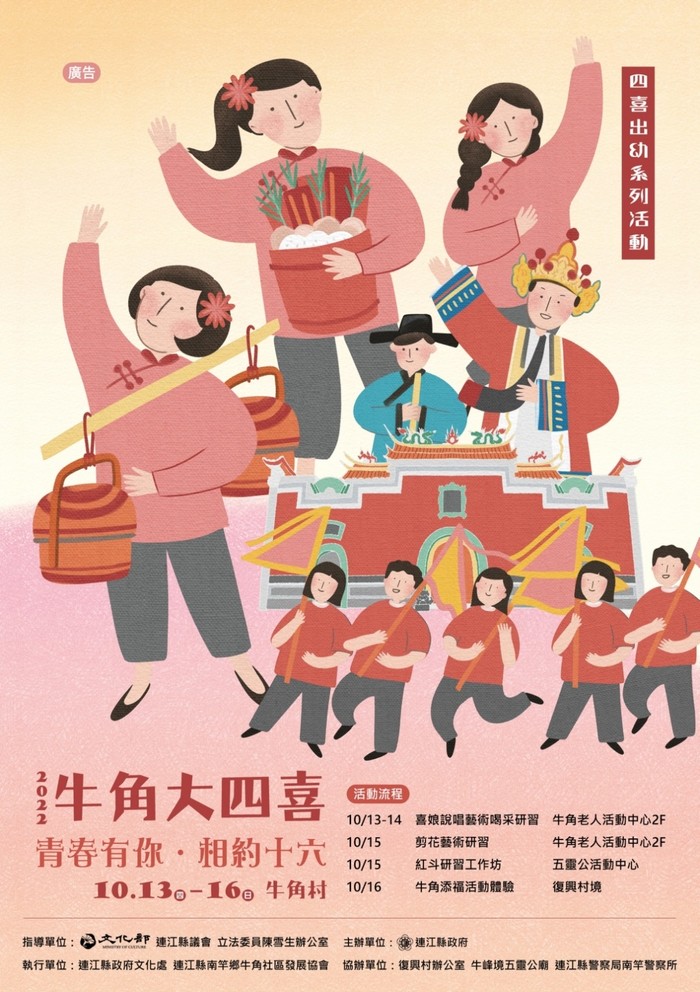 ◆牛角添福活動10/16日早上9點半 由喜娘帶領隊伍從五靈公廟出發到村莊裡送喜喝采添福氣,有興趣的鄉親可以一起來參加