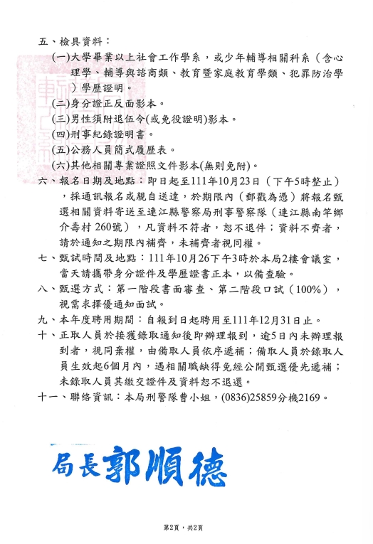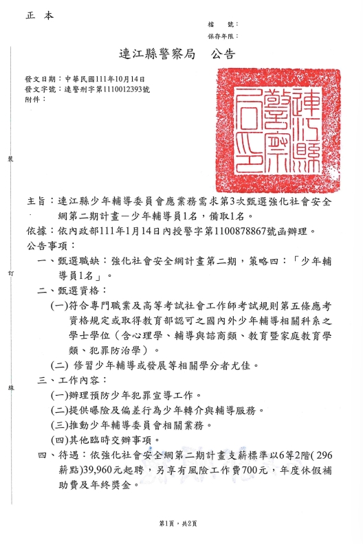 連江縣警察局甄選少輔員1名公告