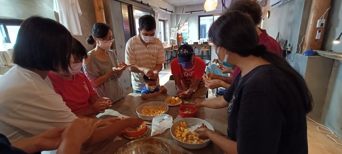 一邊享用自己做的黃金餃點心,透過指導員的引導,大家分享今日的感受和心得,再次感受人與聚落、人與環境的關係,引發學員的反思和策略發想,以達推動永續旅遊的目標。