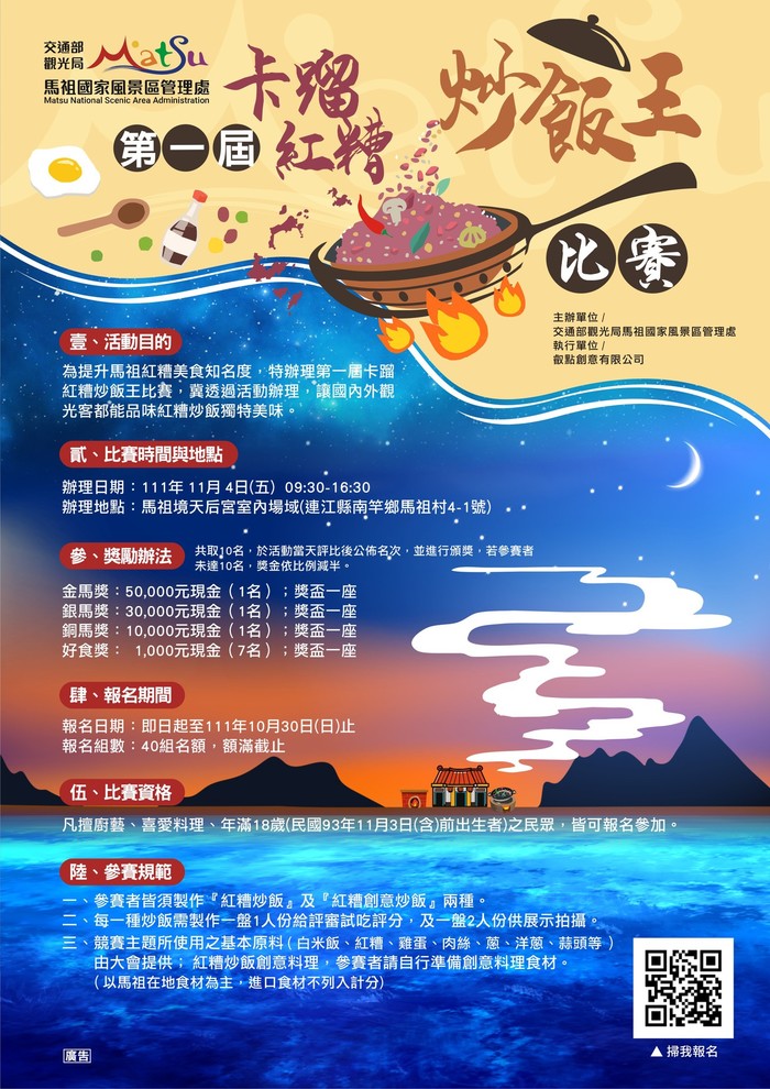 為提升馬祖紅糟美食知名度,帶動紅糟炒飯經濟產業價值,馬管處規劃於111/11/4(五)9:30-16:30假馬祖境天后宮,辦理第一屆卡蹓紅糟炒飯王比賽。 比賽總獎金近10萬元,前三名依序可獲得5萬、3萬與1萬元的獎金,預計評選出10組獲獎者。