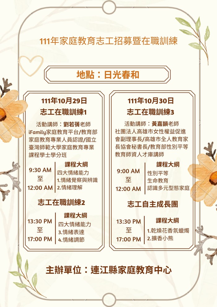 家庭教育志工招募暨在職訓練活動 --閱讀人次 : 1182 連江縣家庭教育中心10月29日及10月30日上午9時至下午17時於日光春和辦理「志工人力運用-志工招募培訓暨在職訓練」活動,課程共2天,歡迎有興趣之民眾報名參加,因場地及座位有限,額滿不開放現場民眾參加。