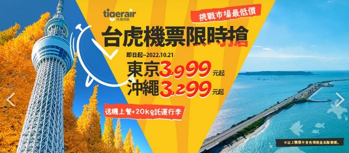 活動內容:挑戰市場最低價,虎航機票東京3,999元起、沖澠3,299元起,再送機上餐及20kg託運行李。