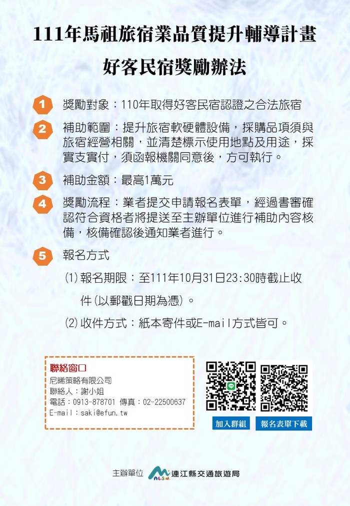 已獲得110年好客民宿獎勵辦法來囉 --閱讀人次 : 760 111年馬祖旅宿業品質提升輔導計畫