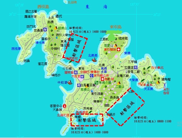各位鄉親大家好,因應中共敵情威脅,為強化官兵突發狀況處置,東引指揮部將於明(21)日至以下海域實施空域射擊,射擊區域及時段如下: