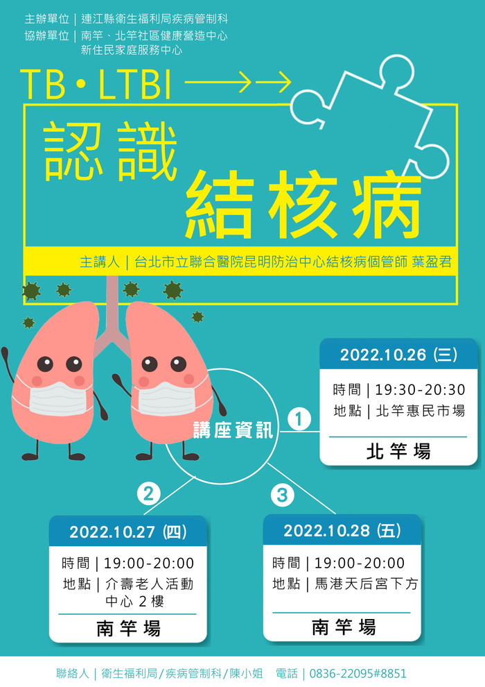 10/26-10/28認識肺結核講座 --閱讀人次 : 755 現今仍有很多人對肺結核疾病存在著:「現在還有肺結核嗎?我只是感冒,肺結核應該離我很遠吧!」的誤解觀念。事實上每年均有逾萬名新發病個案產生,顯示其嚴重性比所有其他傳染病的總和還大。有鑑於此,特邀請台北市立聯合醫院昆明防治中心結核病個管師舉辦「認識肺結核」生活保健講座。