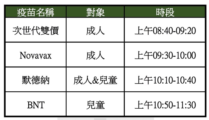 請依以下時段攜帶黃卡、健保卡報到及接種