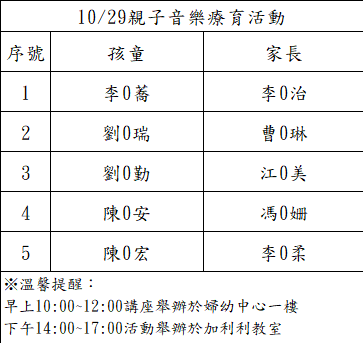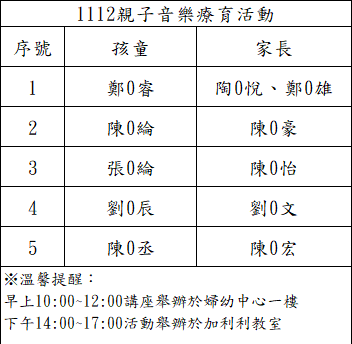 親子音樂療育活動錄取名單-加利利 --閱讀人次 : 717 大家平安,