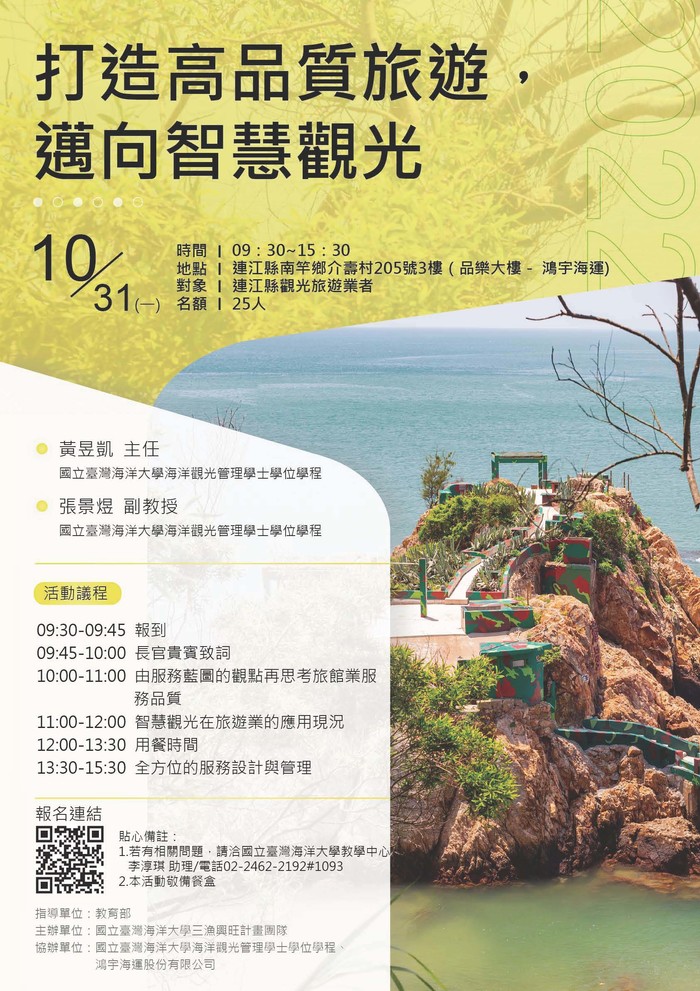 【打造高品質旅遊,邁向智慧觀光】講座 --閱讀人次 : 678 一、活動名稱:【打造高品質旅遊,邁向智慧觀光】