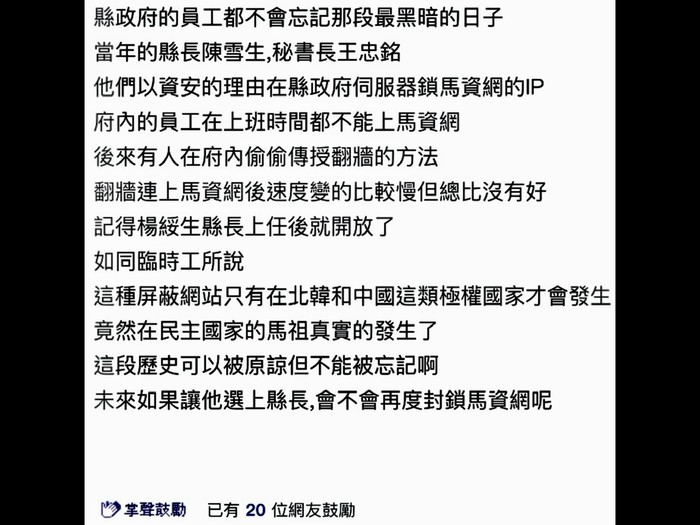 每次都說醫療人情20多年了早就還清了馬祖人不欠陳立委了每天等待李問或是曹爾元建立醫療制度不用再欠人家人情了每次制度化醫療後送更好每次欠人情心裡都有負擔每天擔心封鎖網路的候選人每天不能接受食安五環獎金買縣長座車每天看著專款專用公務原則每天看著督學小編穿競選背心每天等待地檢署政風處主動調查違反行政中立法第九條不得穿著每天拒絕封鎖網路的候選人每天原諒他每天不能忘記他封鎖路