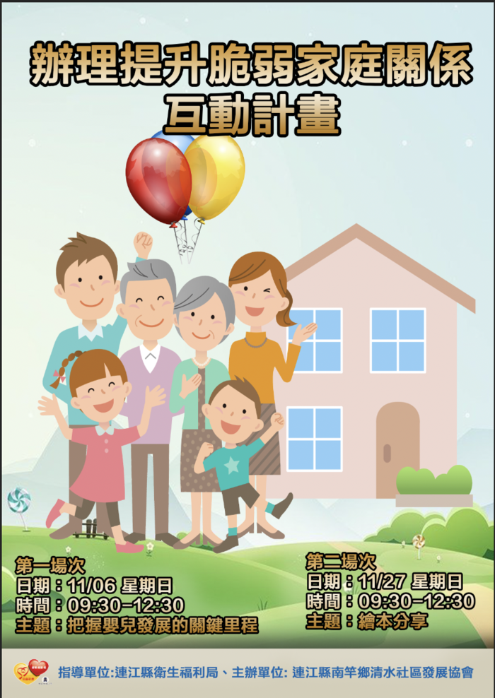 辦理「提升脆弱家庭關係互動計畫」 --閱讀人次 : 792 清水社區發展協會辦理親子共讀及親子手作課程,透過課程互動帶動起家庭與家庭成員彼此支持鼓勵,形成家庭網絡支持系統