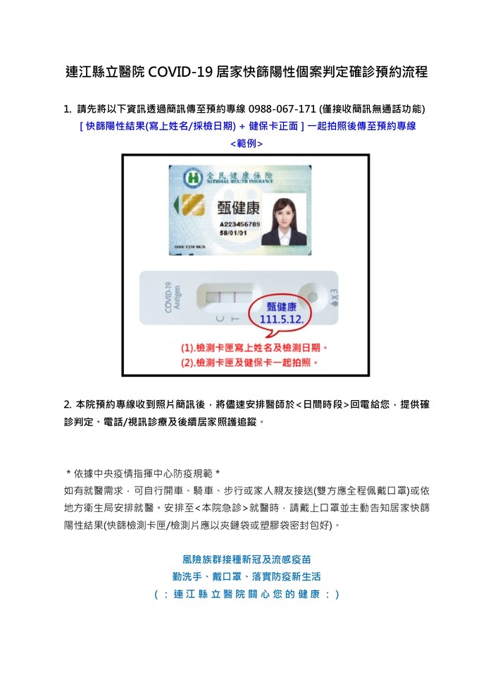 縣醫新冠居家快篩陽性判讀流程 --閱讀人次 : 837 連江縣立醫院COVID-19居家快篩陽性個案判定確診預約流程