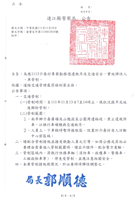 1113介壽村專案勤務交通管制公告