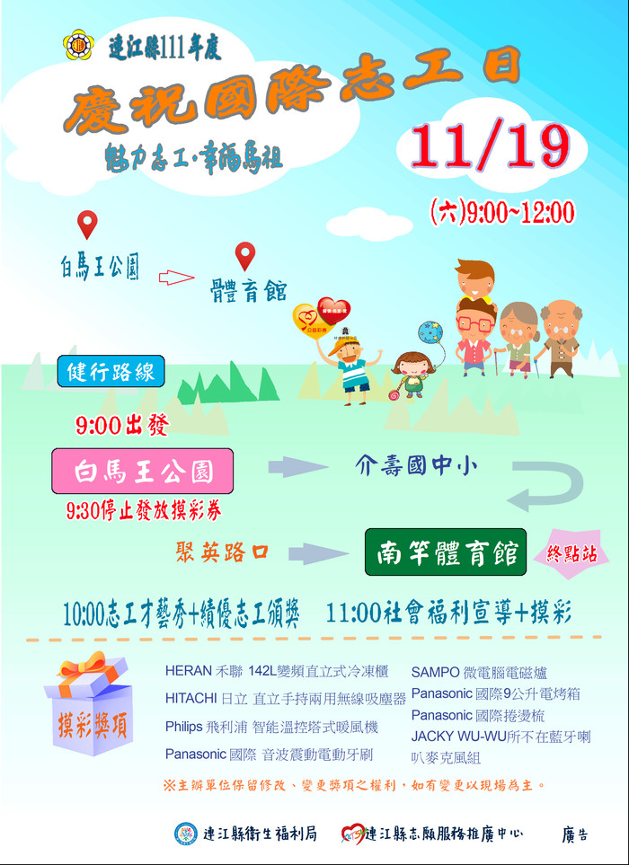 11/19慶祝國際志工日 健行摸彩活動 --閱讀人次 : 2237 一、聯合國大會於1985年宣布每年的12月5日為「國際志工日」,為響應國際志工日及感謝地區各界志工的付出,號召更多鄉親投入志願服務的行列,特於11/19舉辦慶祝國際志工日-「魅力志工·幸福馬祖」志願服務暨社會福利宣導健行活動,邀請志工朋友們與鄉親一起來健走。
